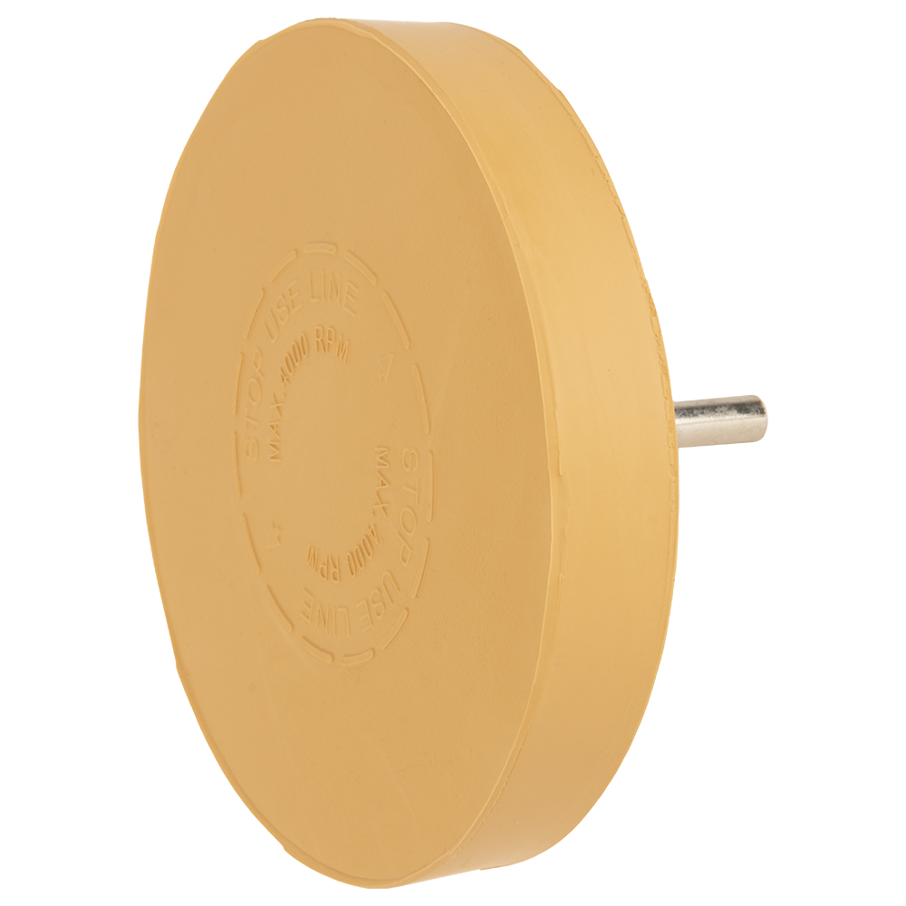 Резиновый диск для работы с клейкими лентами, наклейками, стикерами и аппликациями, не повреждающий лакокрасочное покрытие. Данная форма выпуска обеспечивает отличный отвод тепла из зоны обработки, что обеспечивает более комфортную эксплуатацию. Применяется с зачистной машинкой, имеющей цанговый зажим и максимальную скорость вращения шпинделя до 4000 об/мин. В комплектацию диска входит шпиндель-переходник М8 (диаметром 6 мм)