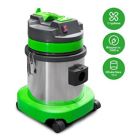 Профессиональный пылесос для сухой и влажной уборки с баком из нерж. стали. Мощность всасывания 1800mmH2O Диаметр трубки 36 мм Длина кабеля 7,2 м Высота модели 55см Производительность 48 л/с Габариты коробки 43*43*60см Вес 11кг