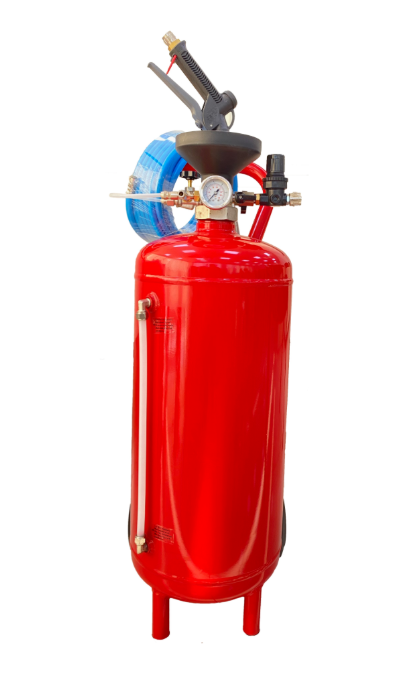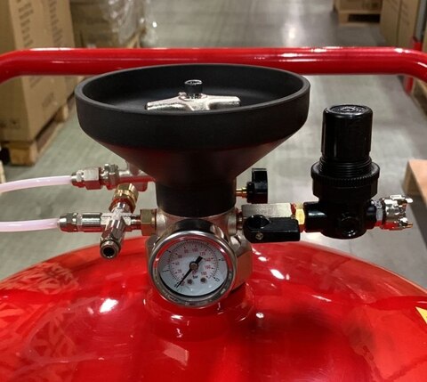 Пеногенератор - аппарат, присоединяемый к магистрали сжатого воздуха с давлением 6-8 атмосфер. Состоит из рабочей емкости, заливочной крышки, регулятор подачи воздуха, регулятор подачи рабочего раствора, шланга подачи рабочего раствора, пистолета пеногенератора. Для залива воды в рабочую емкость используется шланг для подачи воды - может не входить в комплект.